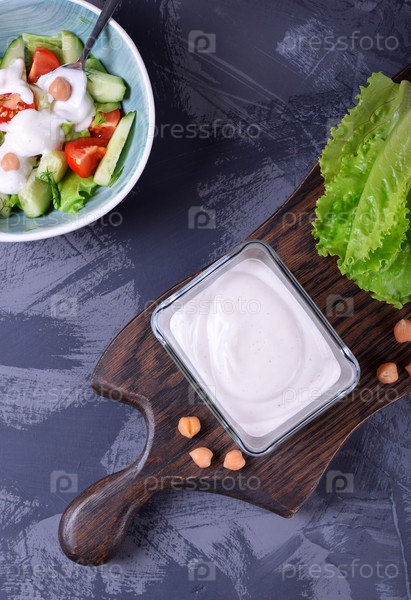 Веганский майонез из нута из аквафабы в стеклянной миске и салат со свежими овощами на сером столе. Заправка для салата