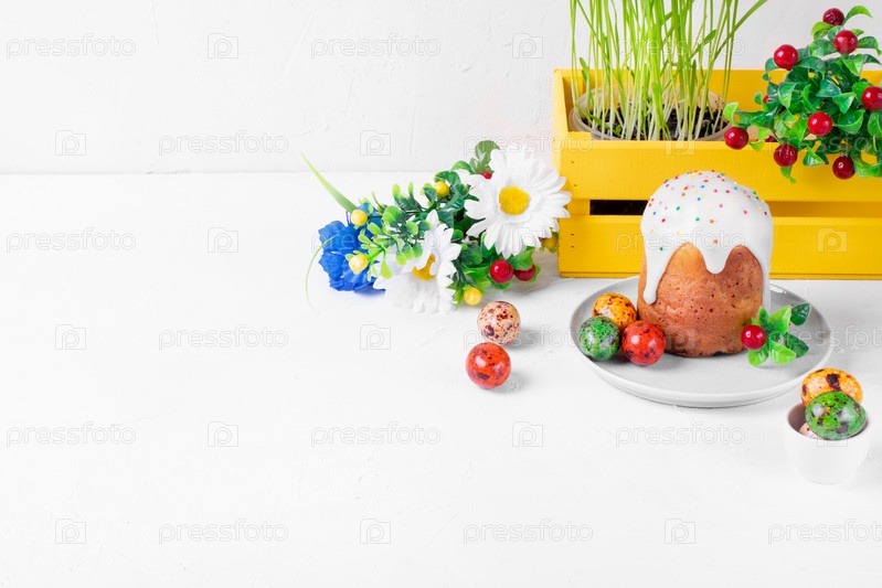 Пасхальная композиция на белом столе. Пасхальный кулич с сахарной глазурью, цветными карамельными яйцами, цветами и проросшей травой в желтой коробке. Скопируйте пространство. Широкий баннер