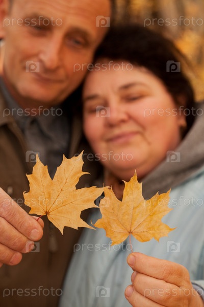 Пожилые муж с женой рассматривают кленовые листья