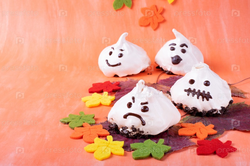 Смешные призраки безе с забавными лицами на оранжевом фоне. Десерт на Хэллоуин