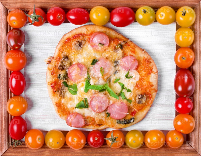 Домашняя мини-пицца с колбасой, грибами и сыром в деревянной рамке, украшенной разноцветными помидорами черри. Несовершенная еда. Идея дизайна интерьера кухни