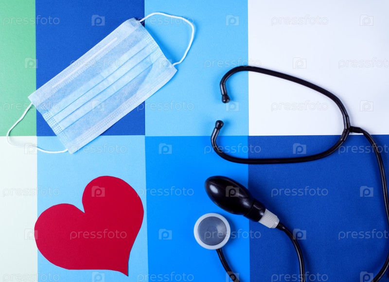 Лампа сфигмоманометра, стетоскоп, одноразовая маска и бумажное сердце на геометрическом фоне. Диагностические медицинские инструменты. Концепция здоровья сердца