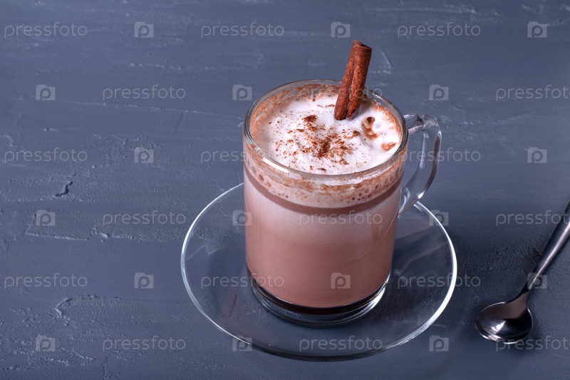 Пенистое какао с корицей на сером столе. Горячий сладкий напиток
