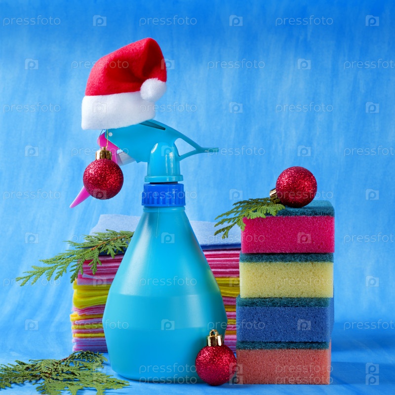 Уборка перед Рождеством. Разноцветные чистящие средства. Губки, тряпки и брызги с праздничными украшениями на синем фоне