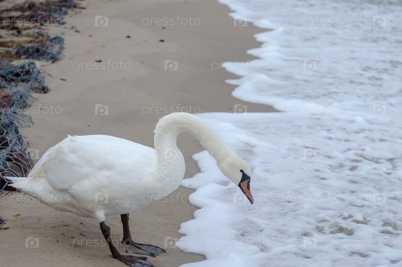 Лебедь на море. Белая птица на фоне песка. Белый лебедь