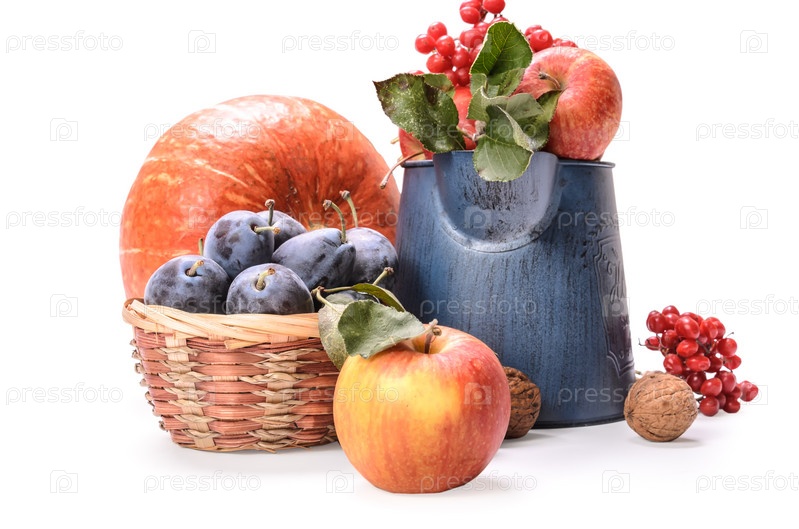 Яблоки в садовом кувшине и другие фрукты на белом фоне с мягкой тенью