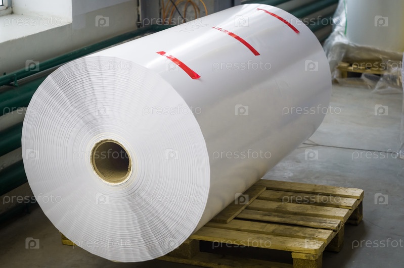 Большой рулон бумаги для типографики. Бумага флексографская белая самоклеящаяся для производства этикеток с цветной печатью. Склад материалов в типографии. Джамбо ролл. Выборочный фокус