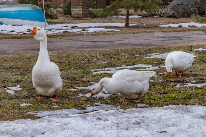 Стая домашних белых гусей на весенней лужайке. Сельский пейзаж. Ходят белые домовые гуси. Домашние гуси