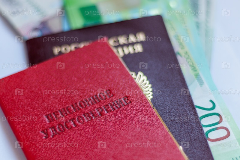 На столе российские банкноты, российский паспорт и пенсионное удостоверение. Надпись: 'Пенсионное удостоверение'