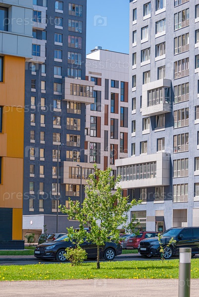 Современный жилой комплекс на фоне голубого неба. Это дома переменной этажности от 7 до 14 этажей, построенные в последние годы. Москва, Россия
