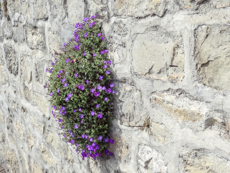 Фиолетовая обриета растет на каменной стене. деревня Сен-Сафорин весной, кантон Во, Швейцария