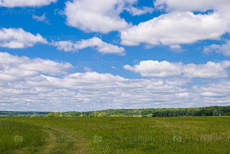 Летний пейзаж. Дорога, зеленая трава и белые облака на фоне голубого неба