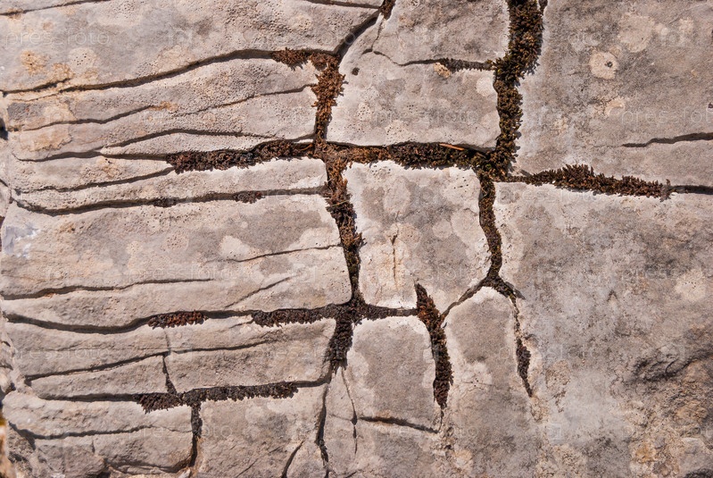 Гладкий природный камень с неповторимыми светлыми прожилками, трещинками, поросшими мхом и лишайником