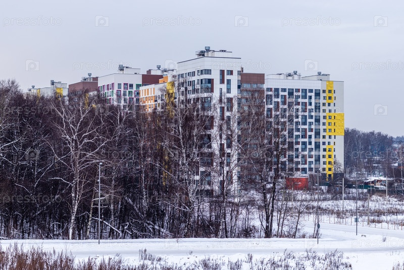 Современный многоквартирный дом с красочными фасадами на окраине города. Москва, Россия