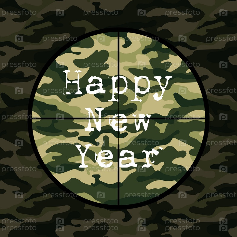 Поздравительная новогодняя открытка в военном стиле со снайперским прицелом на зеленом камуфляже
