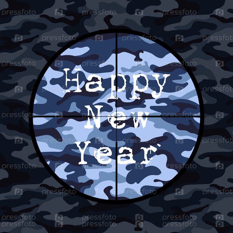 Открытка с Новым годом в военном стиле со снайперским прицелом на синем камуфляже