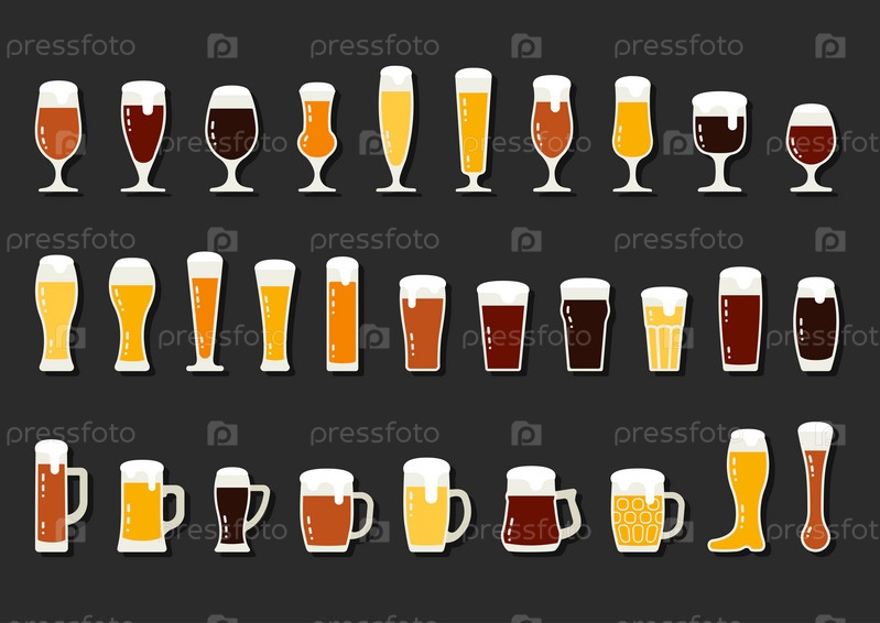 Набор иконок пива с пеной в кружках и стаканах
