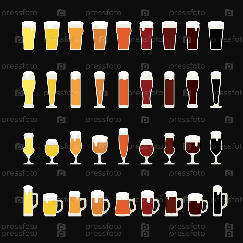 Ряды пива от светлого до темного в различных стаканах и кружках. Иконы пива