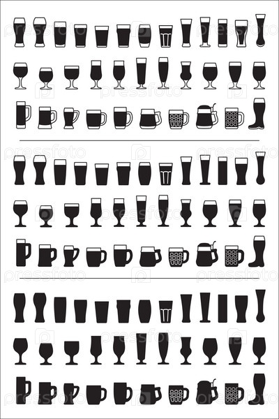 Набор черных иконок пивной бокал. Силуэты пивных бокалов и кружек