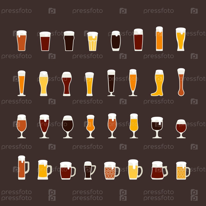 Пивные стаканы и кружки плоский набор иконок, разнообразие пива