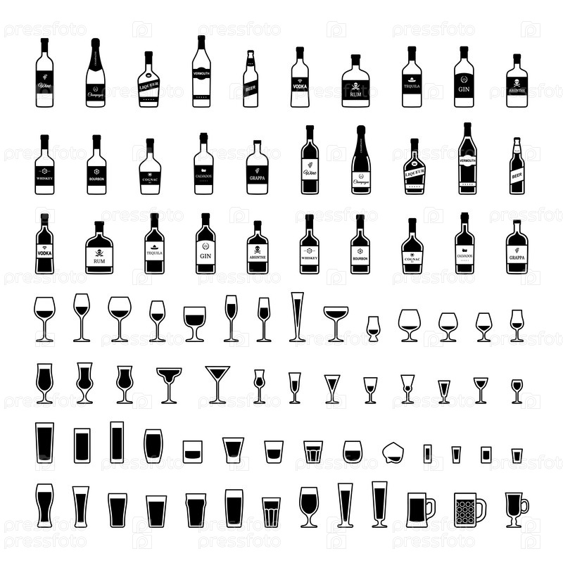 Набор черно-белых иконок, бутылок и стаканов алкоголя