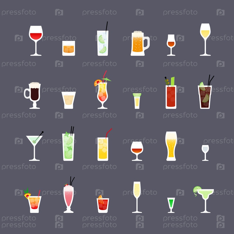 Алкогольные напитки и коктейли, набор плоских иконок