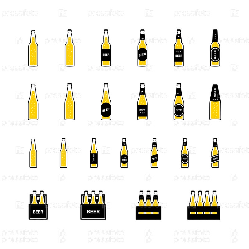 Пиво в бутылках и коробках с пузырьками, цветная иконка на белом фоне