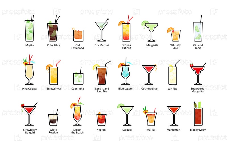 Популярные алкогольные коктейли с названиями, набор иконок в плоском стиле на белом фоне