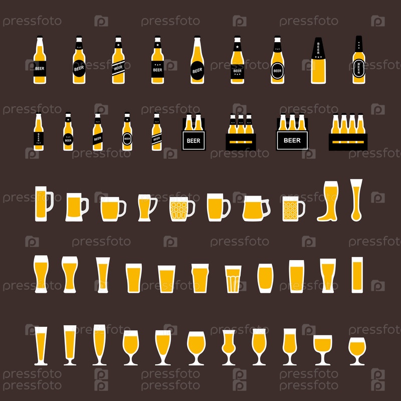Пивные иконки в плоском стиле, бутылки и стаканы