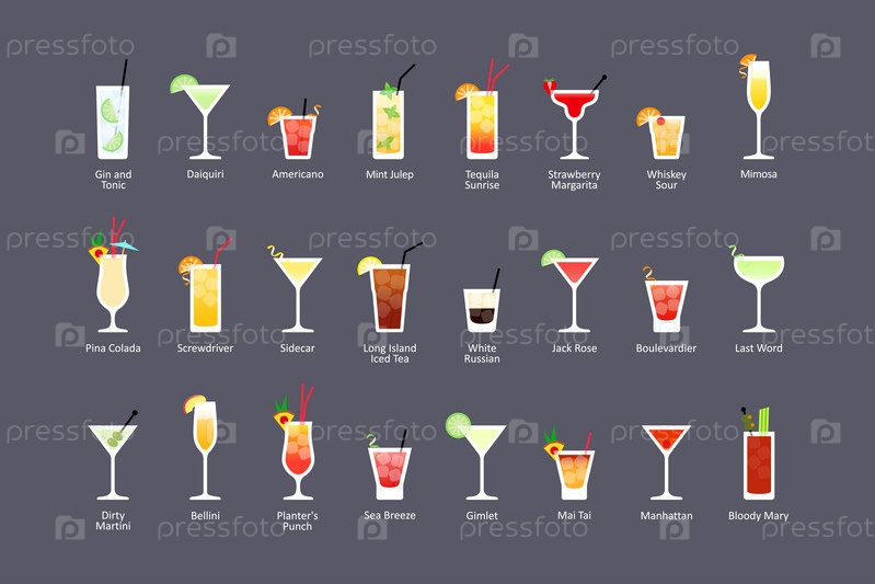 Самые популярные алкогольные коктейли часть 2, набор иконок в плоском стиле на темном фоне