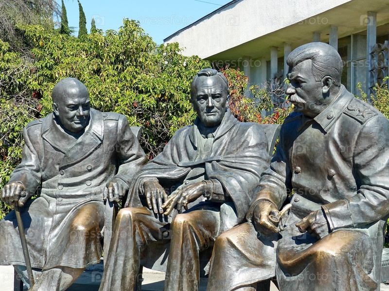 Фрагмент памятника Сталину, Черчиллю и Рузвельту является знаменитой сценой фотосессии лидеров «большой тройки» антигитлеровской коалиции в итальянском дворике Ливадийского дворца во время Ялтинской конференции в феврале 1945. Южный берег Крыма, Россия