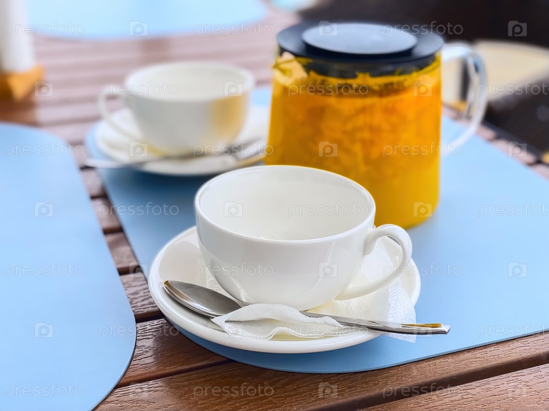 Чай из облепихи в чайнике и две белые чашки на столе в ресторане на открытом воздухе