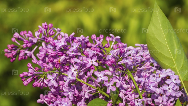 Цветущая ветка сирени. Цветы цветущей пурпурной сирени в весеннем саду при солнечном свете на зеленом фоне