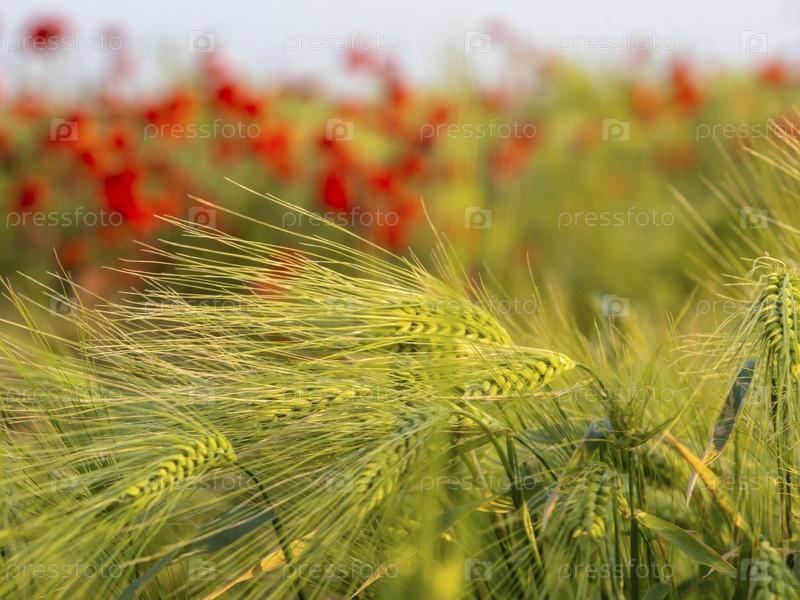 Зеленые колосья ячменя в поле с дикими красными маками. Поле зеленого ячменя и красных маков в сельской местности Европы
