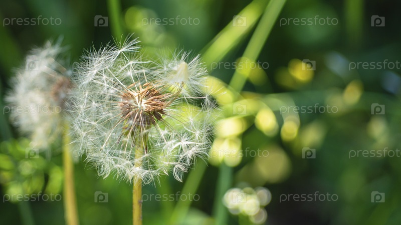 Крупный план нежного одуванчика в солнечном свете на зеленом фоне. Красивый белый одуванчик на солнечной лужайке