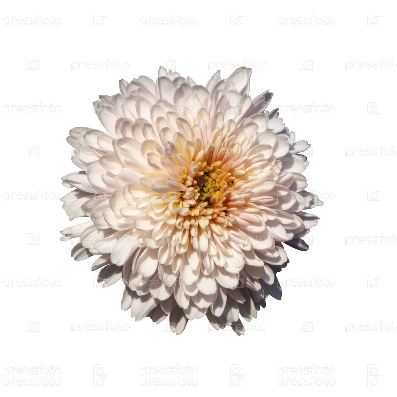 Бледно-розовый цветок хризантемы в пастельных тонах, изолированный на белом фоне. Крупный план одного элегантного бело-розового бутона хризантемы. Вид сверху. Плоская укладка. Весенне-летняя концепция