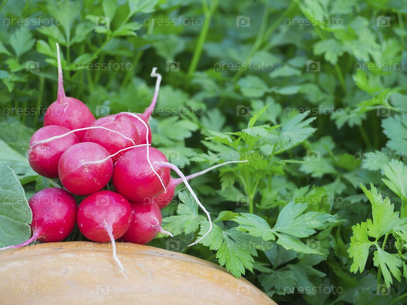 Красная органическая редька рядом с грядкой петрушки. Пучок экоредиса, выращенного в естественных условиях в открытом грунте. Ярко-красный сочный редис на зеленом фоне