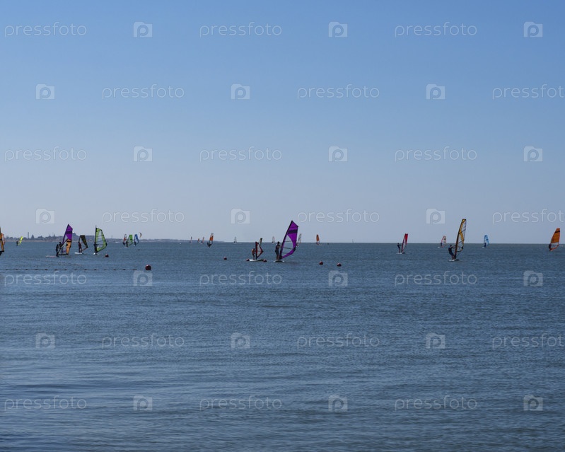 Большая группа виндсерферов плывет по морю