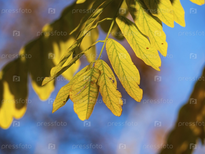 Осенний лист. Золотисто-желтые листья крупным планом на размытом фоне голубого неба. Солнечный свет. Яркий фон осенней листвы. Осенний панорамный фон. Копировать пространство