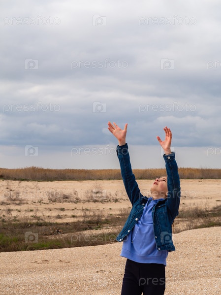 Девочка-подросток в джинсовой куртке смотрит вверх и протягивает руки к небу, стоя на песчаном берегу моря на фоне сухой растительности. Красивая девушка взывает к небу