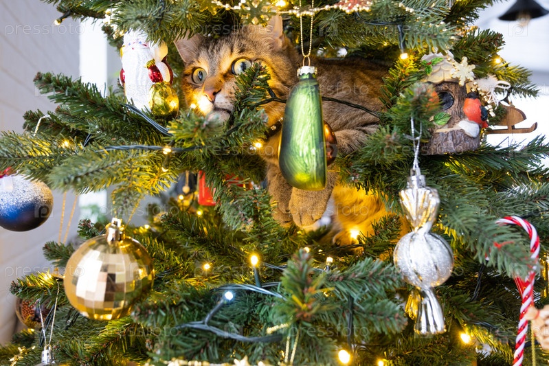 Забавный кот сидит на елке. Хулиганство домашнего питомца, саботаж, порча декора. Рождество, Новый год