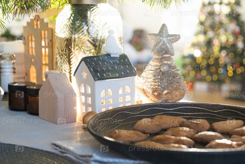 Праздничный рождественский декор на столе, домашняя выпечка на завтрак, выпечка. Уютный дом, рождественская елка с гирляндами волшебных огней. Новый год, новогоднее настроение