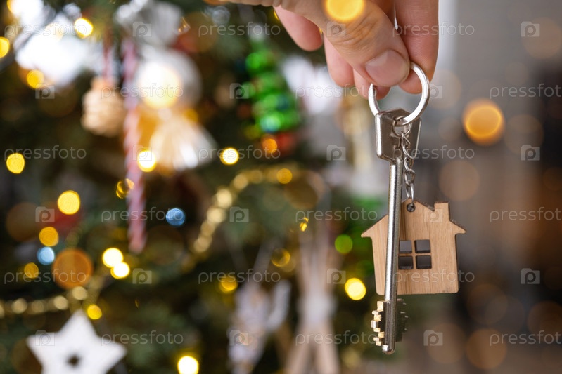 Ключ от дома с брелоком висит на елке. Подарок на Новый год, Рождество. Строительство, дизайн, проект, переезд в новый дом, ипотека, аренда и покупка недвижимости. Копировать пространство