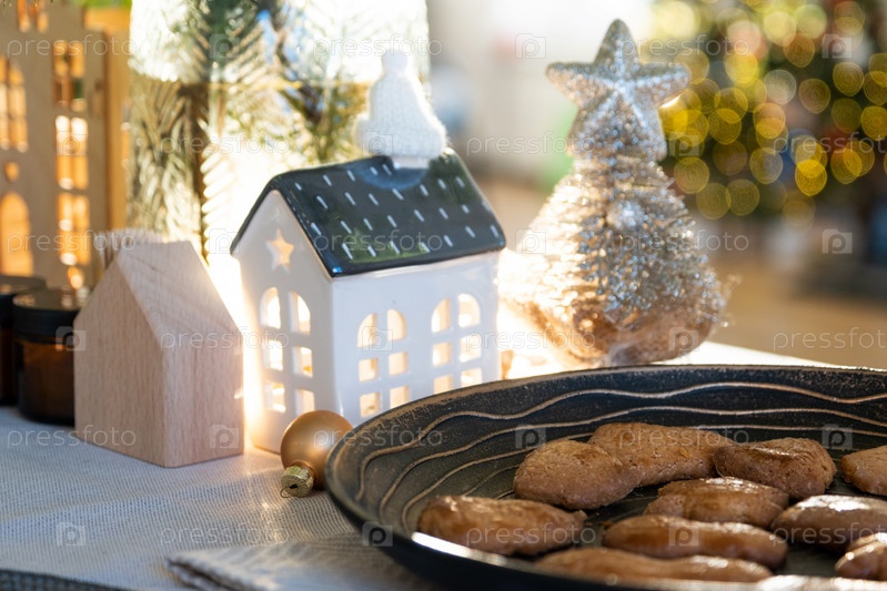 Праздничный рождественский декор на столе, домашняя выпечка на завтрак, выпечка. Уютный дом, рождественская елка с гирляндами волшебных огней. Новый год, новогоднее настроение