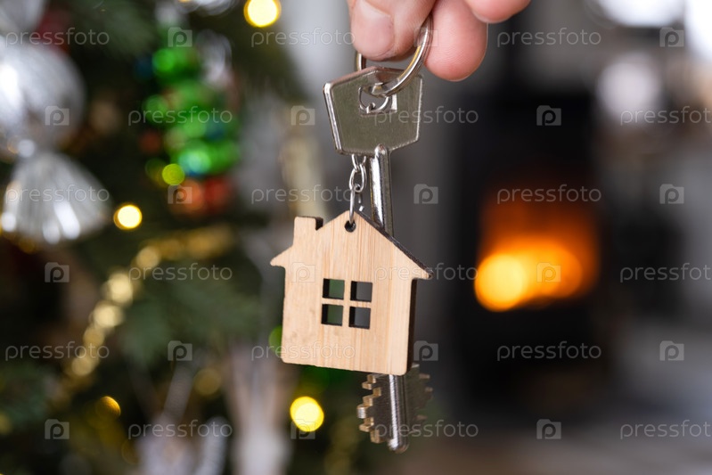 Ключ от дома с брелоком висит на елке. Подарок на Новый год, Рождество. Строительство, дизайн, проект, переезд в новый дом, ипотека, аренда и покупка недвижимости. Копировать пространство