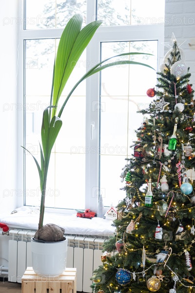 Кокосовая пальма в горшке дома в подарок на Рождество и Новый год. Теплица, уход и выращивание тропических растений