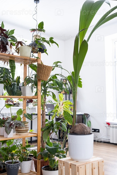 Кокосовая пальма в горшке дома в интерьере. Теплица, уход и выращивание тропических растений