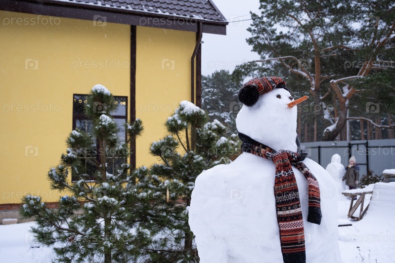 Забавный снеговик в шапке и шарфе на фоне желтого дома во дворе. Зима, зимние развлечения, снегопад