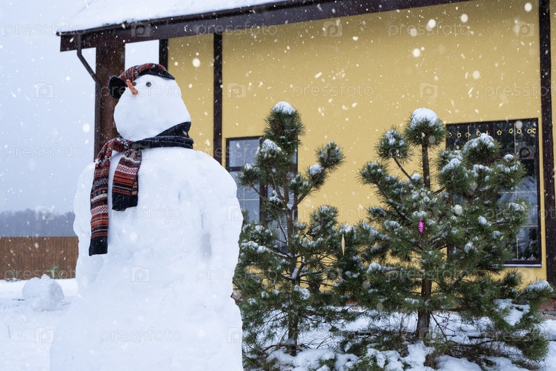 Забавный снеговик в шапке и шарфе на фоне желтого дома во дворе. Зима, зимние развлечения, снегопад