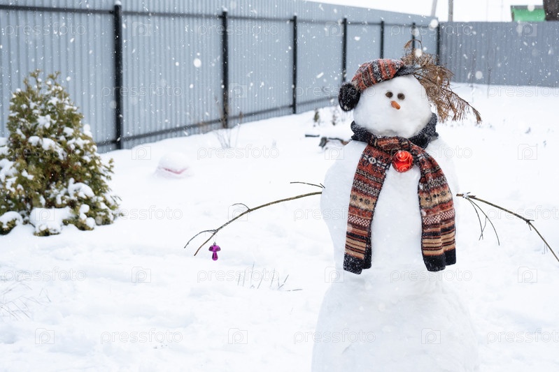 Забавный снеговик в шапке и шарфе на фоне желтого дома во дворе. Зима, зимние развлечения, снегопад